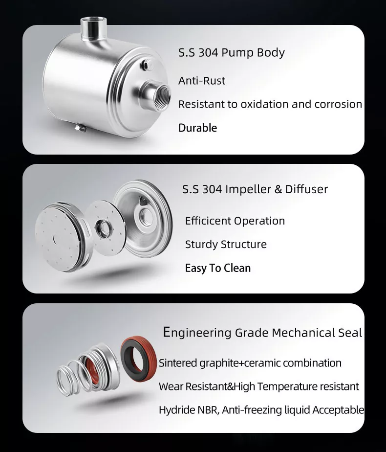 | CHM2-4/EP | 0.55 | 4.5 | 40 | 2m³/h@32m | 4 | 322x174x255 | 12.5 |