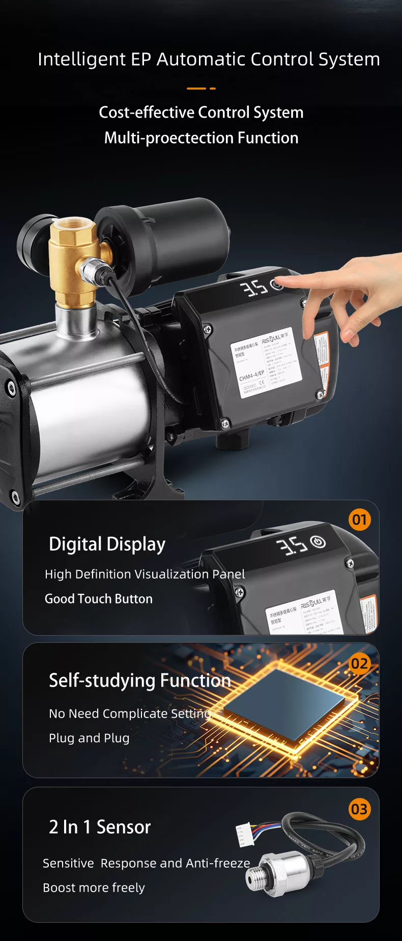 | CHM2-5/EP | 0.65 | 4.6 | 50 | 2m³/h@40m | 5 | 365x189x266 | 14.2 |